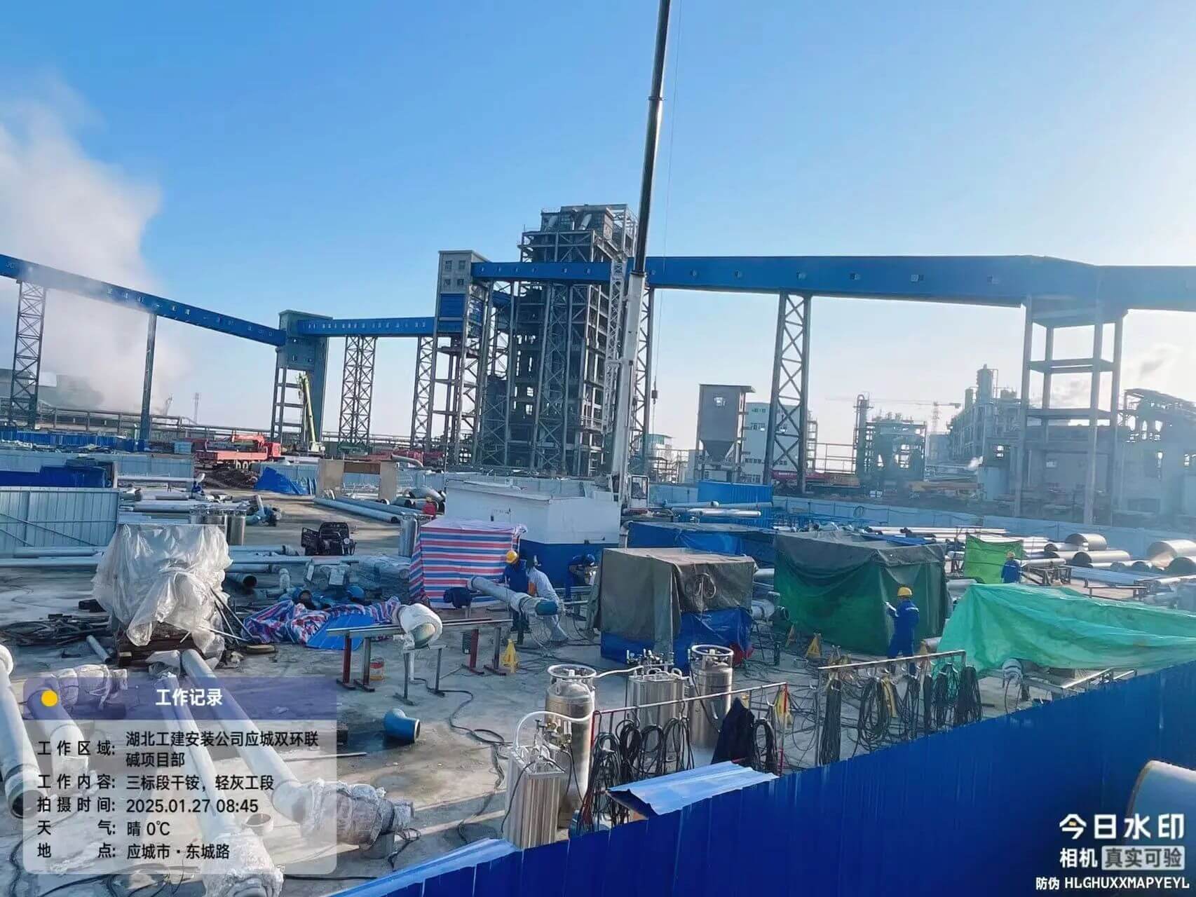 當新年鐘聲在夜空中悠悠敲響,萬家燈火漸次亮起,勾勒出團圓的溫馨畫面時,湖北應城雙環堿改項目施工現場卻依舊燈火通明,機器的轟鳴聲交織成一曲奮進的樂章。項目土建、設備、管道專業施工已完成 90%,距離竣工近在咫尺。春節期間,項目建設進入關鍵沖刺階段,施工團隊爭分奪秒,全力推進電氣儀表安裝和試壓包管道作業,為節后電纜敷設和水壓試驗的順利開展筑牢根基。